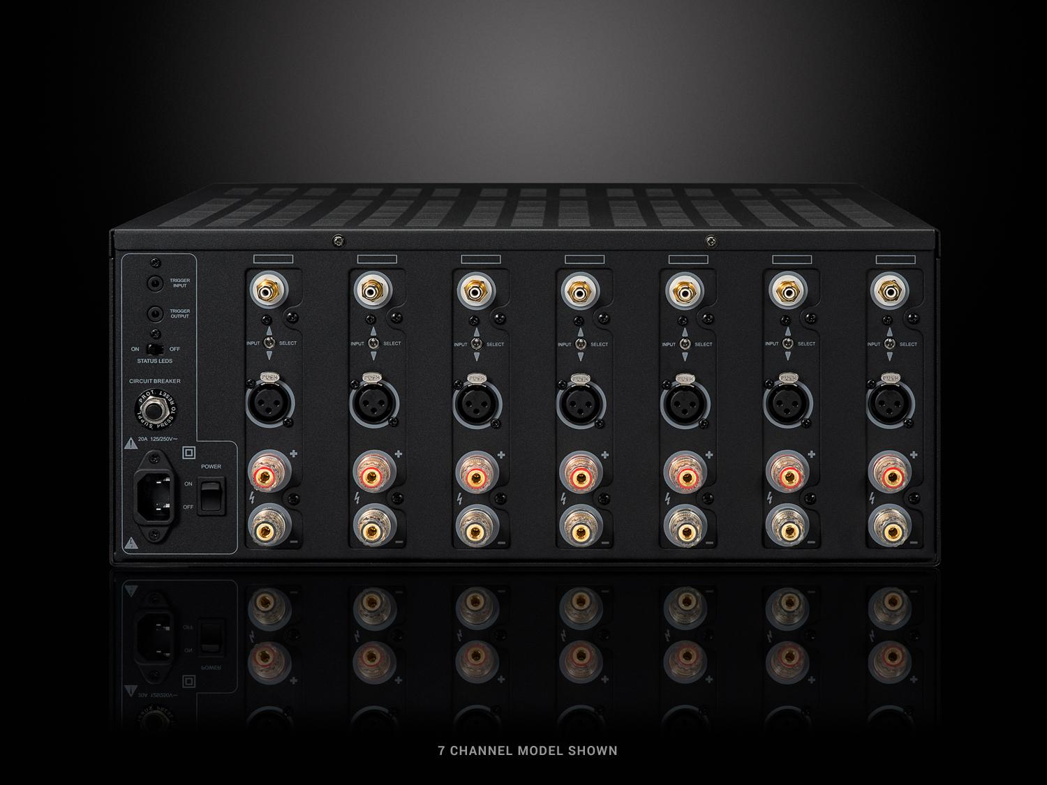The XPA Gen3 modular power amplifier is comprised of a heavy-duty chassis, which houses the oversized power supply, and up to seven amplifier modules. The XPA Gen3 can be purchased with anywhere between two and seven amplifier modules installed, and additional amplifier modules may be installed as more channels of amplification are needed (up to a maximum of seven modules). The front panel display and protection system are designed to work with the maximum number of channels, and so need not be updated when the XPA Gen3 is expanded; on the rear panel, slots not occupied by amplifier modules will be covered with protective cover panels.
