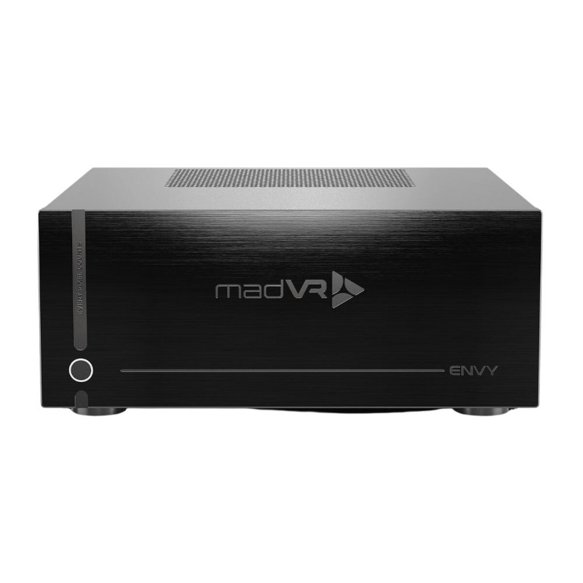 Our meticulous attention to detail in the design and engineering of the MK2 is evident in every aspect, from the engineering around the state-of-the-art GPU, all the way down to the tiniest of details, such as the custom case screws that ensure a perfect finish. The case’s seamless one-piece design for the lid and side walls creates a modern, high-end look. The brushed-black anodized aluminum front panel is finished with an elegant madVR logo, “Envy”, and the company’s tag line “Every Pixel Counts” inscribed, creating a sophisticated yet understated design.